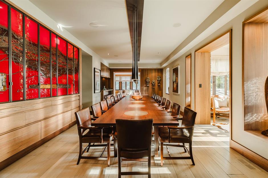 Habitué à collaborer avec de nombreuses personnes tout au long de sa carrière, Guy Laliberté n’a pas laissé le hasard dicter l’aménagement de sa salle à manger : une vaste table y accueille jusqu’à 20 convives dans un cadre élégant et chaleureux.